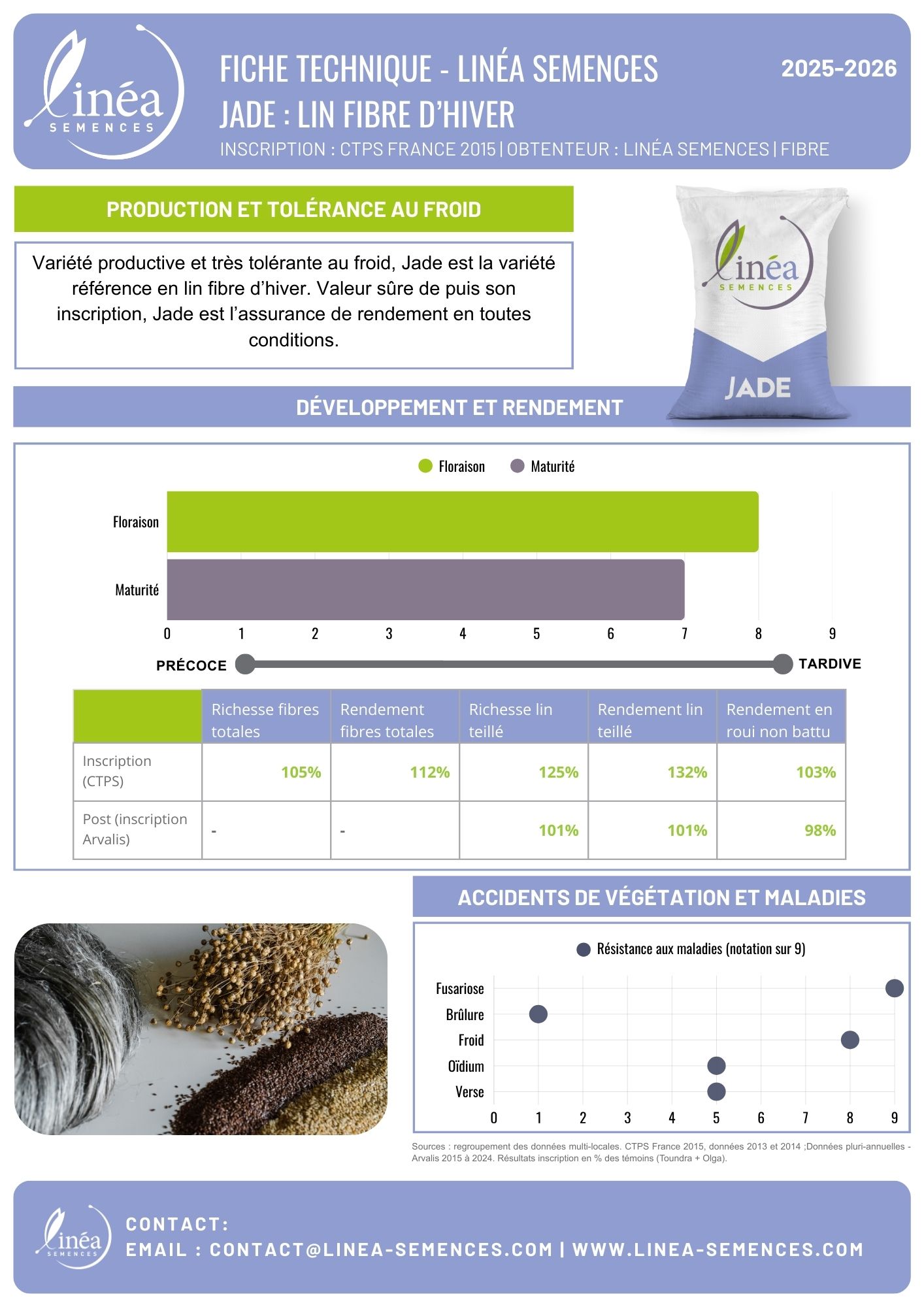 Variété productive et très tolérante au froid, Jade est la variété référence en lin fibre d’hiver. Valeur sûre depuis son inscription, Jade est l’assurance de rendement en toutes conditions.