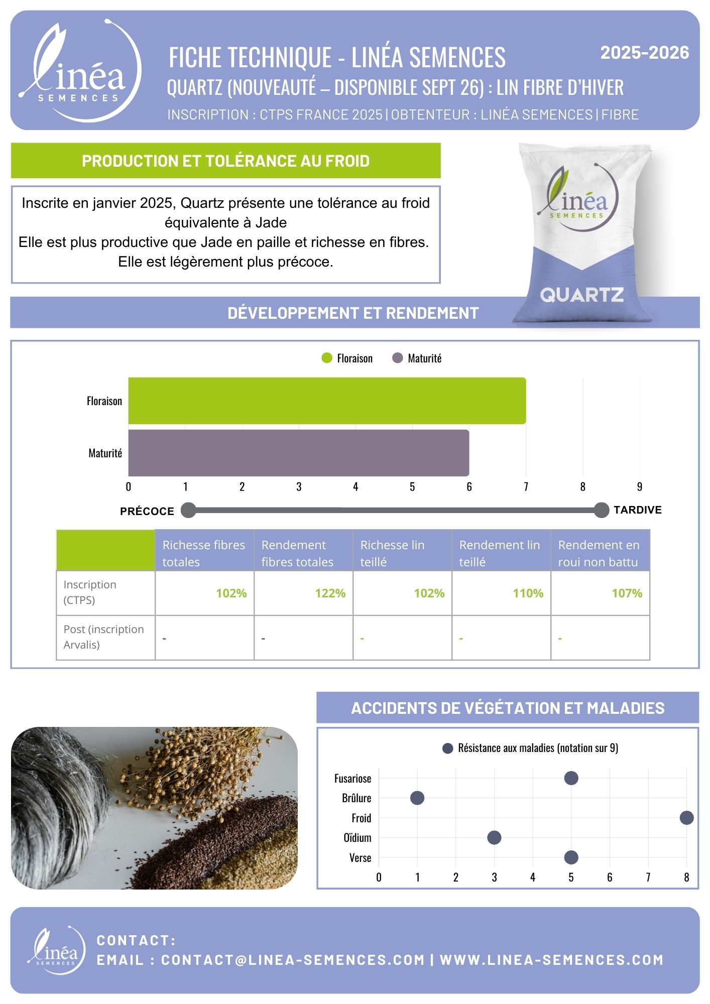 Inscrite en janvier 2025, Quartz présente une tolérance au froid équivalente à Jade. Elle est plus productive que Jade en paille et richesse en fibres. Elle est légèrement plus précoce.