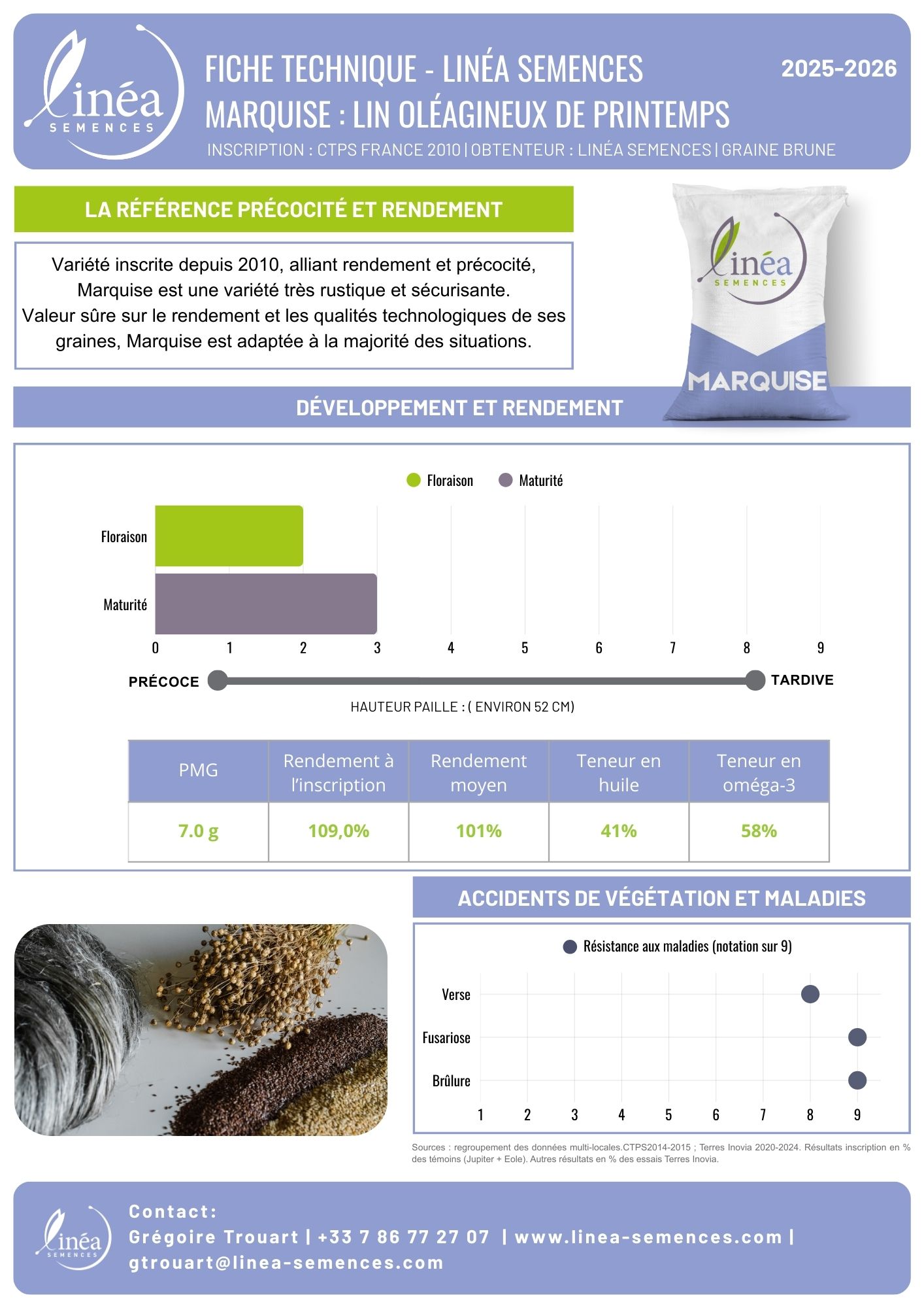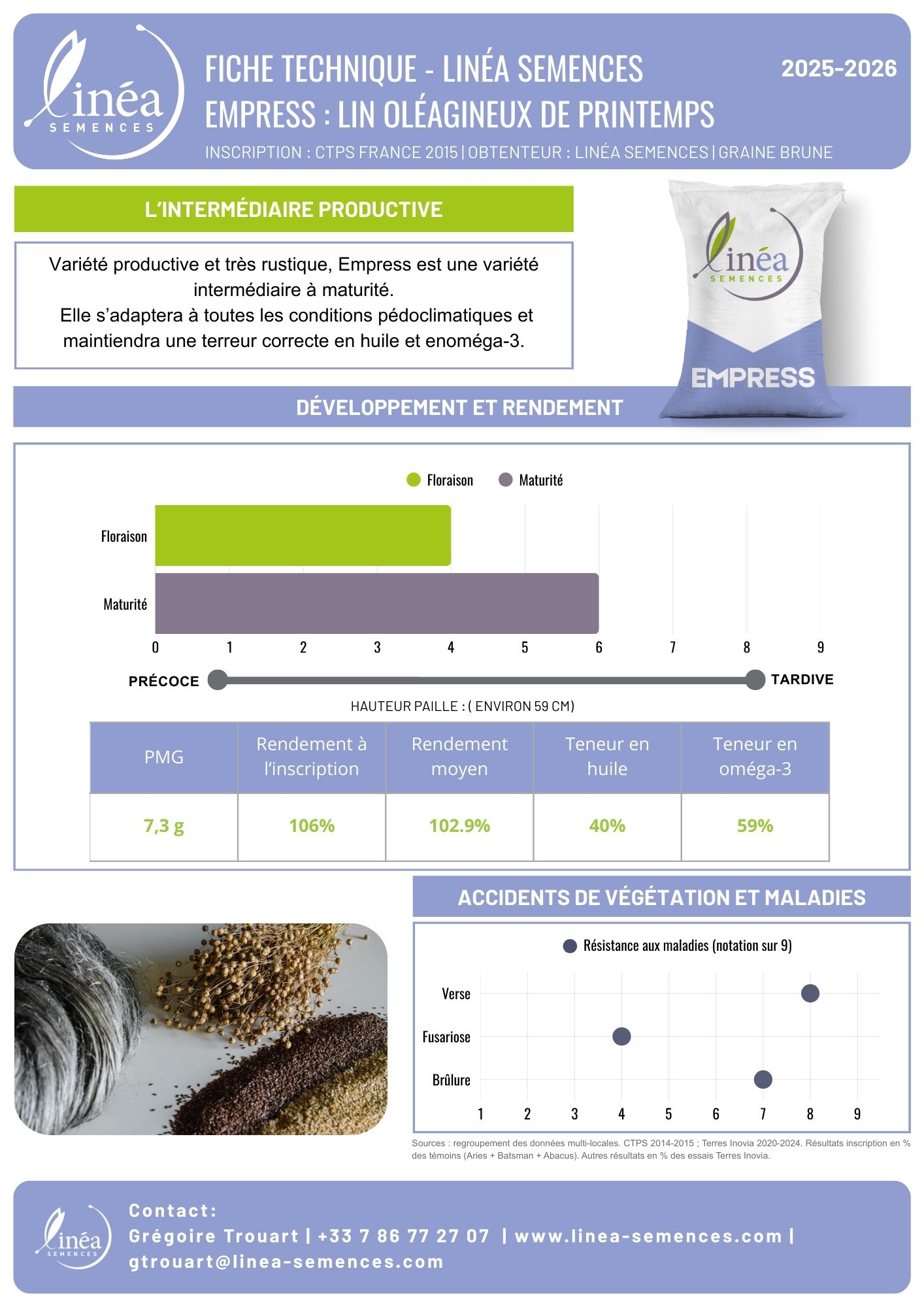 Variété productive et très rustique, Empress est une variété intermédiaire à maturité. Elle s’adaptera à toutes les conditions pédoclimatiques et maintiendra une terreur correcte en huile et en oméga-3.