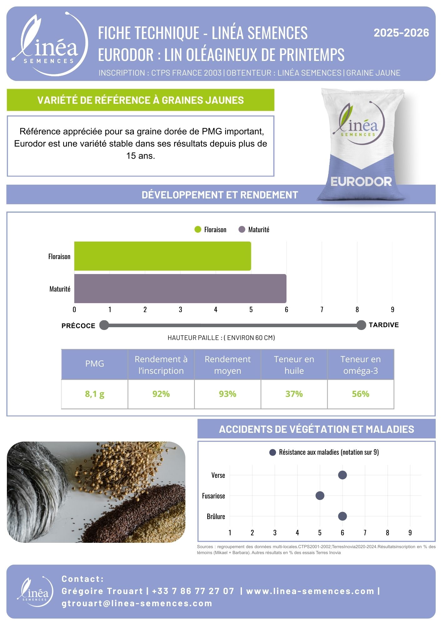 Référence appréciée pour sa graine dorée de PMG important, Eurodor est une variété stable dans ses résultats depuis plus de 15 ans.
