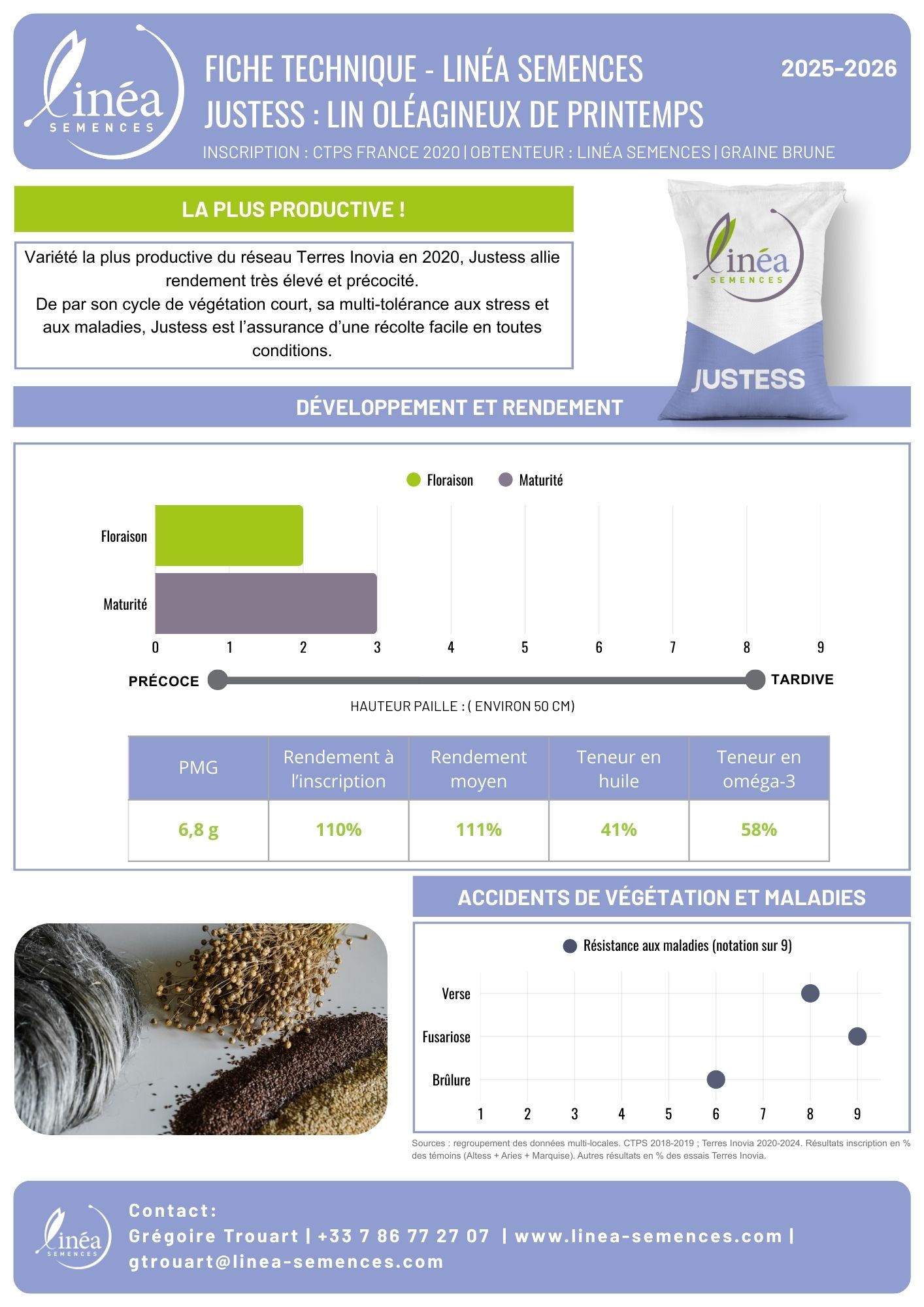 Variété la plus productive du réseau Terres Inovia en 2020, Justess allie rendement très élevé et précocité.